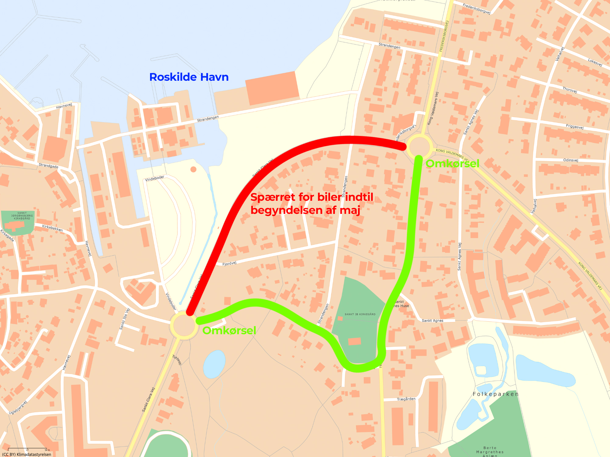 Omkørslen er ad Frederiksborgvej og Sankt Ibs Vej. Cyklister og gående kan stadig bruge Sankt Clara Vej.