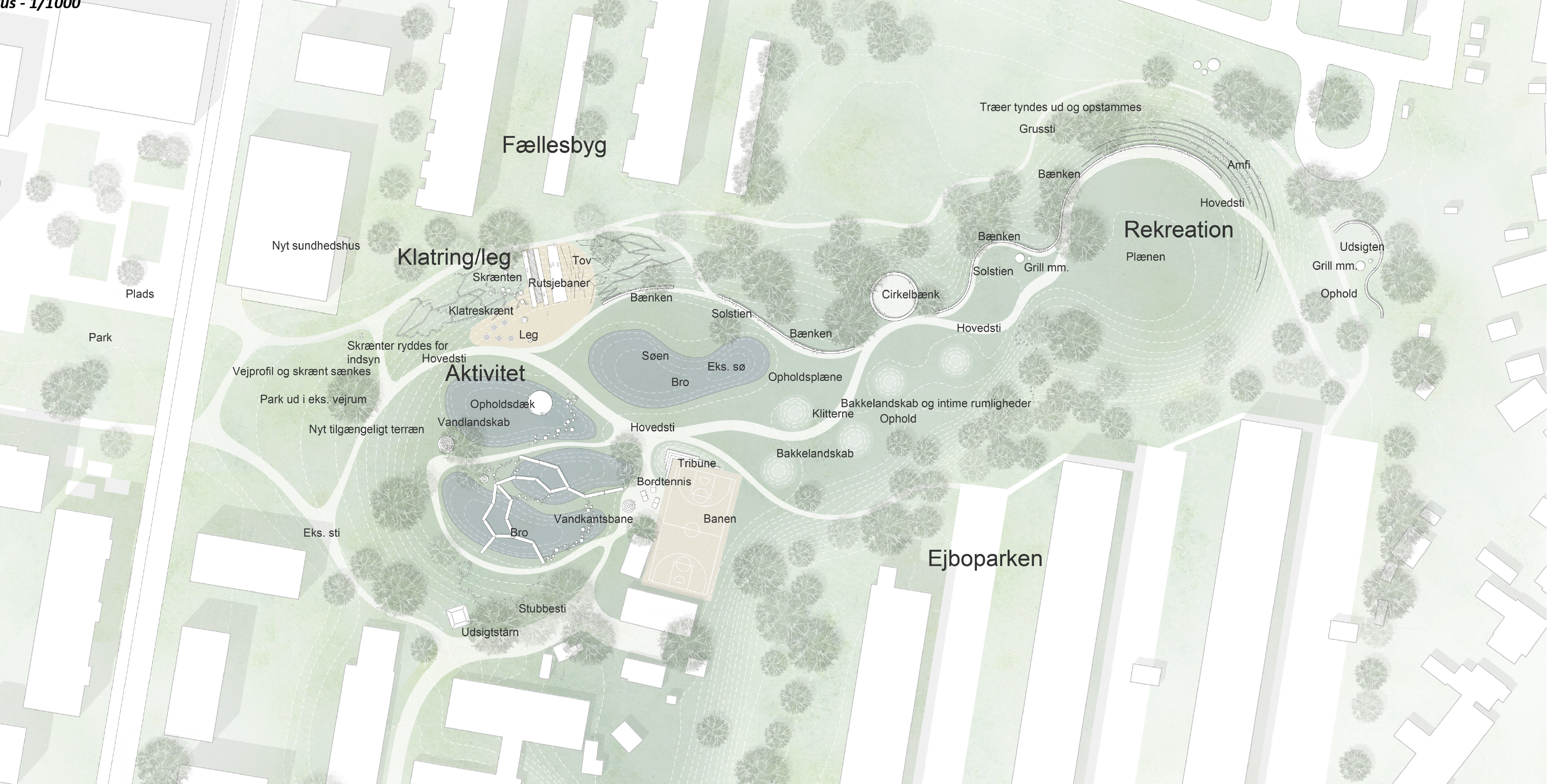 - Generelt opgraderes parkens inventar og etableres "øer" til ophold på hele nordsiden af parken,