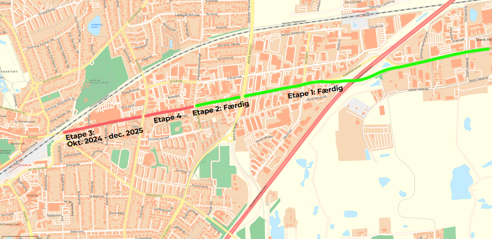 Etape 2, som er fra Hedeboparken / Præstemarksvænge (ved Q8 tanken) og ud til Østre Ringvej er også færdig.