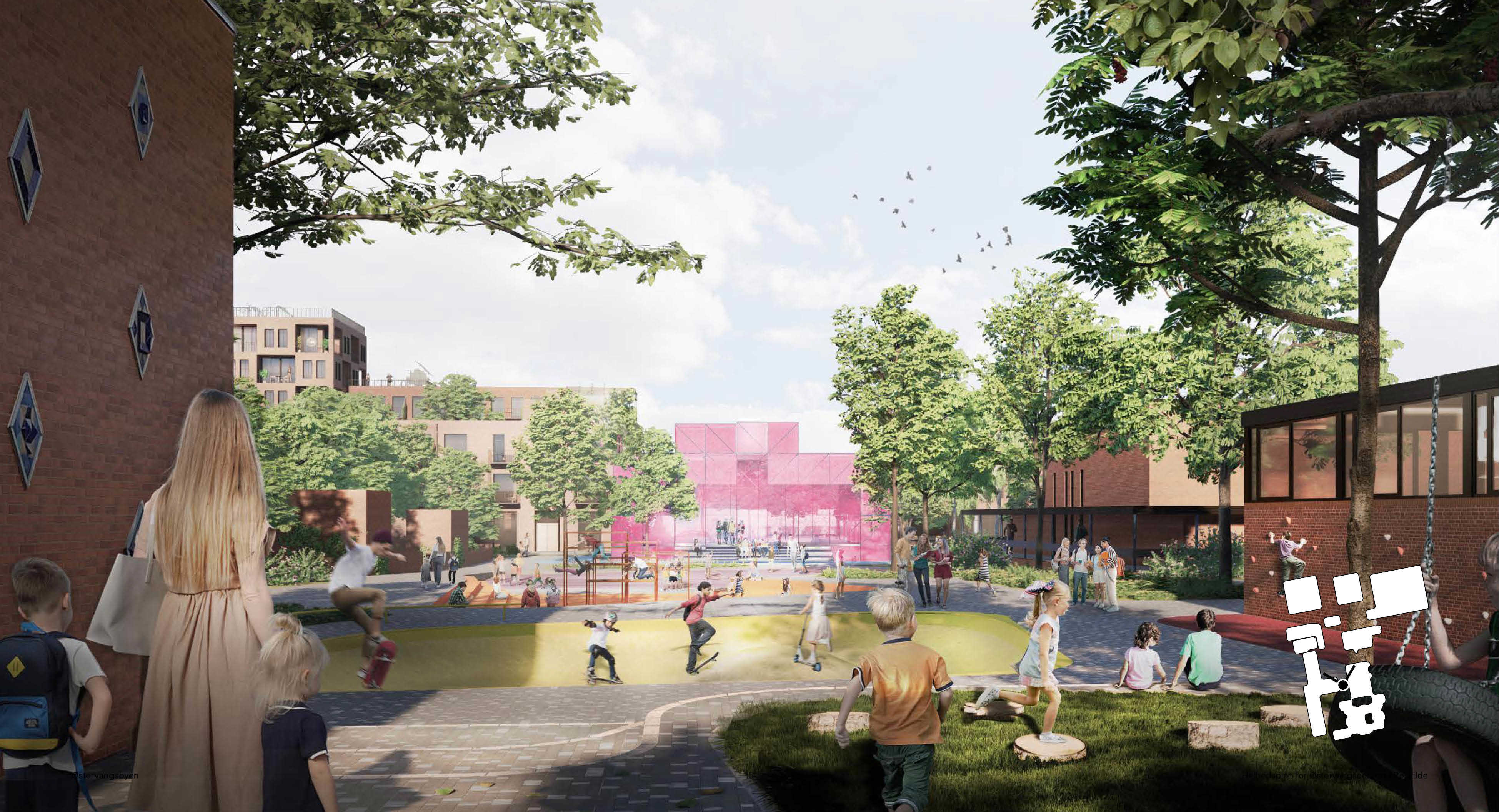 Efter ønske fra følgegruppen arbejdes med at etablere en musikpavillon centralt i byrummet, hvor kirke, skole, klub og børnehus kan optræde med musik og andre indslag. Det foreslås at åbne Østervangsskolens nordlige skolegård mod det nye byrum og give adgang for andre brugere uden for skolens og klubbens åbningstid. Der etableres en grøn korridor til Granlyskoven gennem Østervangsskolens idrætsanlæg, der udvikles med nye faciliteter.