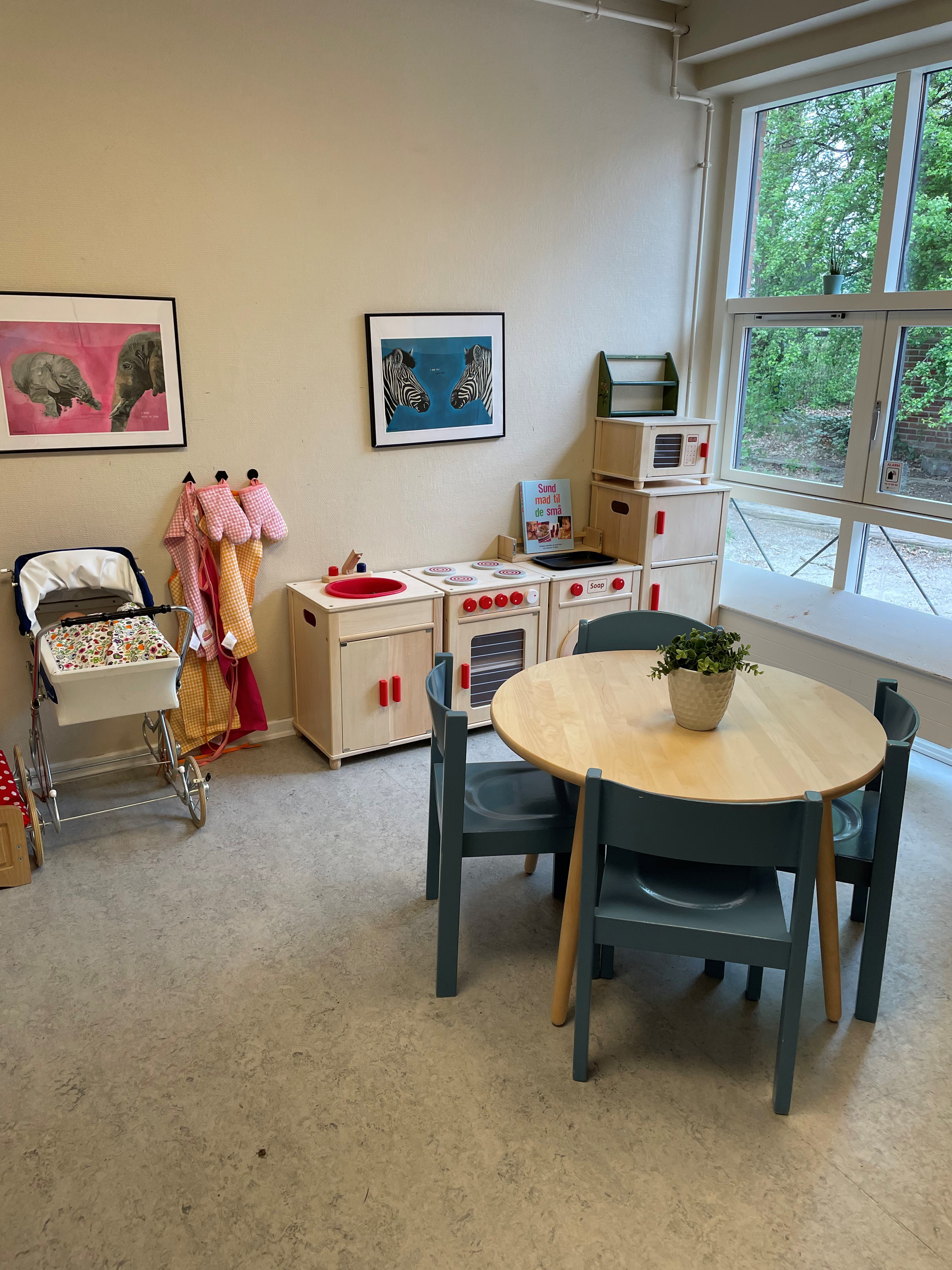 Vi skaber tydelige og inspirerende læringsmiljøer, hvor børnene let kan gå i gang med leg. Indretningen og legetøj udskiftes løbende, så de passer til børnenes behov og nysgerrighed.